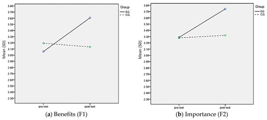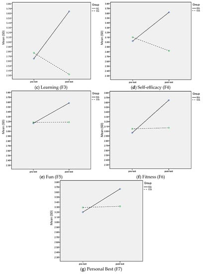 The results found in Table 3 revealed significant main effects on Group for importance (p = 0.012), learning (p < 0.001), self-efficacy (p < 0.001), fun (p = 0.034), and fitness (p = 0.022) scales. Effect sizes for the Group main effect were relatively small (η2 < 0.12) for all scales, except for Learning (η2 = 0.23).