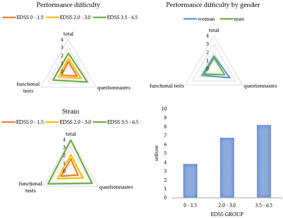 Figure 3 and Figure 4 display a graphical representation of these results. The higher the disability (EDSS), the more challenging and straining pwMS rated the gait assessment. This applied to the questionnaires as well as to the functional tests. The higher the disability (EDSS), the more the patients utilized the results for themselves and the more often they welcomed the implementation of the gait assessment. Women perceived the functional tests and questionnaires to be more difficult than men did, and men asked for a more frequent implementation compared to women. The results also showed that a higher age predicted less difficulty in performing (B = -0.03), and a longer disease duration was associated with more perceived difficulty (B = 0.03) and strain (B = 0.03) when performing the functional tests. The method of conducting the questionnaires had no influence on PREMs.