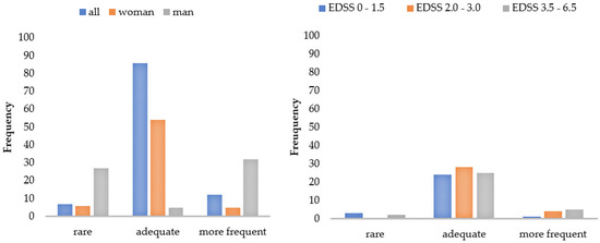 Patient ratings of the implementation frequency by subgroups. Number of patients who would like to receive the walking assessment less/more often or as currently applied. EDSS = Expanded Disability Status Scale.