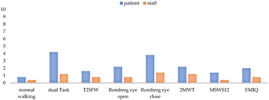 Test difficulty rating for each test from 0 (easy) to 10 (very difficult) for the patient and the staff from staff’s perspective. Normal walking means walking over a mat with a self-selected comfortable walking speed. T25FW = the timed 25-foot walking; 2MWT = 2-min walk test; MSWS-12 = Multiple Sclerosis Walking Scale; EMIQ = Early Mobility Impairment Questionnaire.