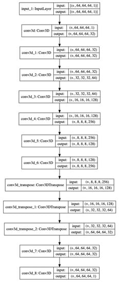 The structure of the autoencoder, which consists of nine 3D convolution layers and three 3D convolution_transpose layers, generates compressed images with sizes of (8, 8, 8, 128). n is the number of input data.
