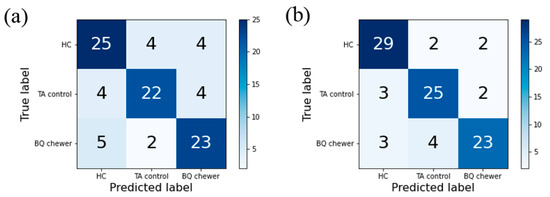 In the multiclass classification, LR reached 75% accuracy with mfALFF and 83% accuracy with mReHo. The results showed that LR had an impressive performance in classifying the HC and TA controls as mutually exclusive from the BQ chewers using rs-fMRI as input features. In addition to the accuracy, the confusion matrix (Figure 3), correct classification rate of each category and Cohen’s kappa coefficient (Kappa) were also recorded (Table 2). The highest accuracy, CCR of each category, and kappa were observed with mReHo (accuracy = 0.83, CCR of BQ = 0.77, CCR of TA = 0.88, CCR of HC = 0.83, kappa = 0.74).