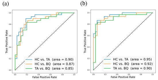 ROC curves and AUC of LR with (a) mfALFF (HC vs. TA, HC vs. BQ, and TA vs. BQ) and (b) mReHo (HC vs. TA, HC vs. BQ, and TA vs. BQ).