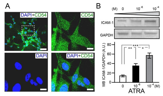 Intercellular adhesion molecule 1 is located in the nucleus and cytosol with increased expression in response to ATRA. Confocal micrographs of U87MG showing immunohistochemical detection of ICAM-1 (CD54; Alexa fluor 488; green) and nuclear stained DAPI (blue) (A) after 7 days of ATRA (10−4 M) treatment. Scale bar 100 µm. White dashed box region ((A), upper left) is shown in higher magnification (×40, (A)) to highlight the presence of ICAM-1 in the nucleus and cytosol. Scale bar 20 µm. Representative Western blot (upper (B)) and analysis (lower (B)) indicates the incremental increased expression of ICAM-1 in response to higher ATRA concentrations. * p < 0.05, ** p < 0.005, *** p < 0.0005, n = 2.