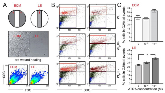 The effects of ATRA on the migration and invasiveness of glioma remains poorly understood, although it is universally accepted that it can induce apoptosis and inhibit proliferation in GBM [26,27,28,29]. Nevertheless, the association between the concentration and effects of ATRA and GBM proliferation remains unclear [30]. U87MG is regarded as a proliferative GBM cell line that forms fast-growing tumors when inoculated orthotopically into a mouse [31]. This study chose to examine the proliferative activity of U87MG (passage 5) following ATRA exposure in two regions of an in vitro culture environment i.e., LE and ECM. Five days after wound formation, exposure to ATRA and EdU labelling, U87MG cells were removed and processed for flow cytometry. Results showed that the ECM and LE cells differed slightly in the forward scatter pattern (Figure 3A) indicative of the presence of mature cells with alternative structural conformation in the former zone. Gating analysis for the selection of cells in G2 phase enabled the effects of plus/minus ATRA exposure to be determined (Figure 3B,C).