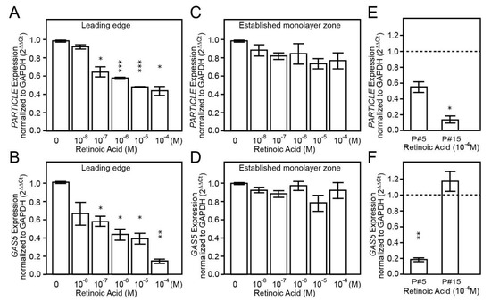 Long non-coding RNA PARTICLE and GAS5 respond to ATRA in U87MG leading edge cells and not in the established cellular monolayer zone with differential passage effects. Histograms of quantitative real time PCR data of PARTICLE and GAS5 showing decreased expression profiles in leading edge cells in response to increased ATRA concentrations (A,B). Neither PARTICLE nor GAS5 show differential expression in response to increased ATRA concentrations in the established cellular monolayer zone of U87MG (C,D). Histograms highlight reduced levels of PARTICLE with passaging (E) in contrast to GAS5 which shows significantly elevated expression in later passages (F). * p < 0.05, ** p < 0.005, *** p < 0.0005, n = 3.