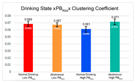 The bars capture the slope of the relationship between clustering coefficient and connection strength, across drinking states and as PBRSA increases. Numbers above the bar are slope values, and numbers in parentheses are standard error. At lower RSA values, there is minimal difference in the relationship between drinking states, whereas at higher PBRSA values, there is a much larger change in the slope of the relationship between clustering and strength.