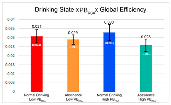 (Trending only). The bars capture the slope of the relationship between global efficiency and connection strength, across drinking states and as PBRSA increases. Numbers above the bar are slope values, and numbers in parenthesis are standard error. At both the upper and lower bounds of PBRSA, the relationship between global efficiency and strength was steeper during normal drinking. At lower PBRSA values, the slope decreased minimally during abstinence, whereas at higher PBRSA values, the slope decreased to a more significant degree following abstinence.