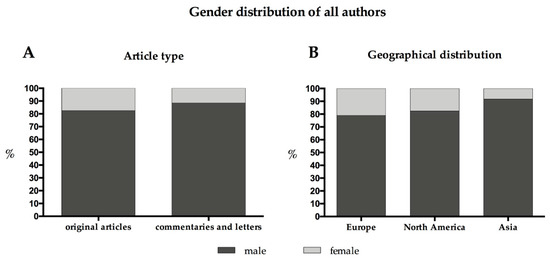 Gender distribution of all authors: (A) by article type and (B) by geographical distribution.