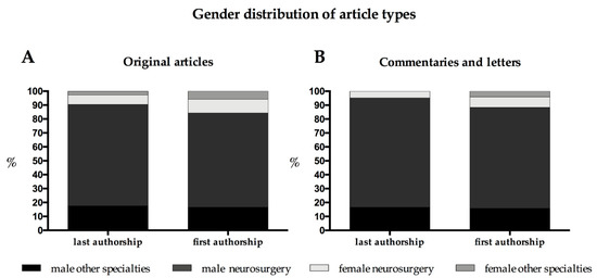 Gender distribution with regard to article type distinguishing authors affiliated to a neurosurgical department and those not affiliated to a neurosurgical department; (A) original articles; (B) commentaries and letters.