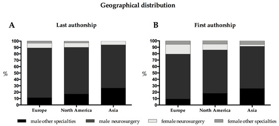 With respect to affiliation to a neurosurgical department, neither ratios for the first nor last authorships differed significantly comparing female with male authors (each for Europe, North America and Asia).