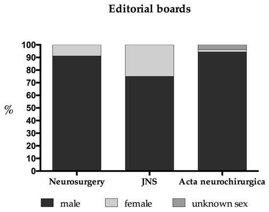 The specific editorial boards may be regarded as the final organs of policymaking. Thus, the composition of each editorial board was documented additionally. All editors in chief of the surveyed journals are male; Acta and the JNS present so-called “associate editors” and “co-chairs”, of which all are male (Acta: six out of six, JNS: four out of four). There is 1 female editor out of 53 in the editorial board of Acta (with two editors whose sex we were not able to determine) and 0 female editors out of 30 in the advisory board. The JNS editorial board (without including the topic specific issues such as JNS Spine, etc.) includes 6 women out of 19 editors (31.6%). The editorial board of Neurosurgery is structured differently: The editorial advisory board consists of 2 females out of 60 editors (3.3%) and 1 female international advisory editor out of 81 (1.2%). There is also a Neurosurgery Editorial Review Board structured by topics: out of a total of 140 members 20 are female (14.3%), whereas all of the section editors (n = 16) are male. Summing up all of the members of the editorial boards of the journals surveyed, we find a female participation of 8.0% (Neurosurgery: 23 out of 260 (8.1%); Acta: 1 out of 90 with two persons of unknown sex (1.1%); JNS: 6 out of 24 (25%)) (see Figure 4).