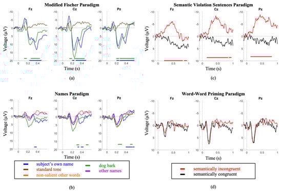 - Holeckova, I.; Fischer, C.; Giard, M.-H.; Delpuech, C.; Morlet, D. Brain responses to a subject’s own name uttered by a familiar voice. Brain Res. 2006, 1082, 142–152. [Google Scholar] [CrossRef]