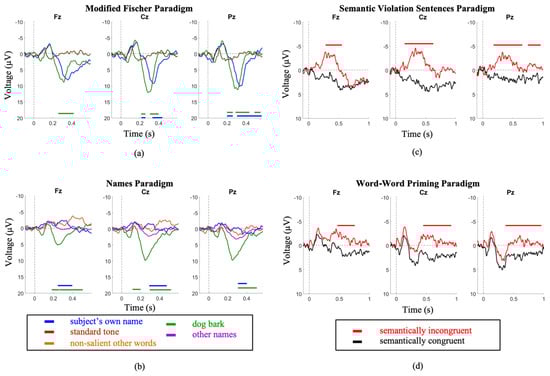 For each paradigm, stimulus type averages were compared on a point-by-point basis using serial t-scores to identify significant differences over time [45,65]. P300 analysis was performed on the difference waves (MF paradigm: subject’s own name—standard tone and bark—standard tone; SON paradigm: subject’s own name—other names, bark—other names, and non-salient other words—other names). N400 analysis was performed on the difference waves between congruent and incongruent sentences for both the SVS and WWP paradigms. Waveform comparisons were conducted using the serial t-score method with differences significant at p < 0.05.