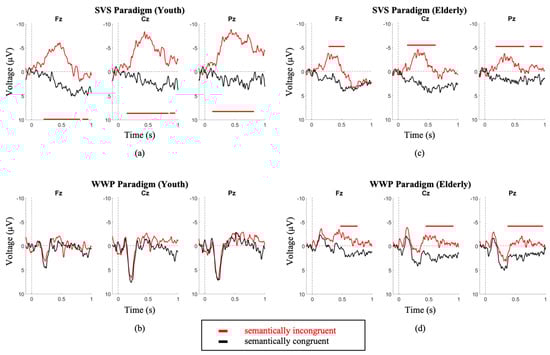 Youth (a,b) and Elderly (c,d) group grand average waveforms. the SVS paradigm elicited a larger N400 amplitude in the youth (Youth = −8.7 ± 4 (a); Elderly = −3.9 ± 2.8 (c); p = 3.3 × 10−2). The WWP paradigm elicited an N400 in the elderly (d) (p < 0.05) but not in the youth (b). Intervals of significance indicate where the semantically incongruent waveform is significant in relation to the semantically congruent stimulus. Time periods where significant differences occurred are indicated by color-matched bars.