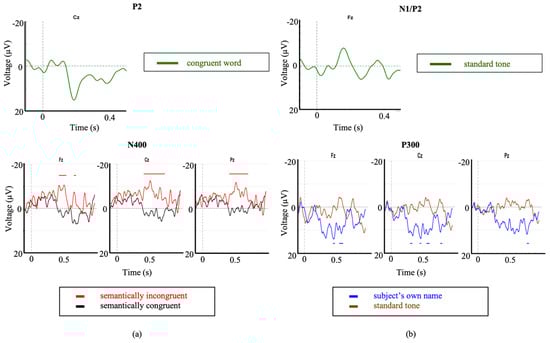 - Connolly, J.; Phillips, N.A. Event-Related Potential Components Reflect Phonological and Semantic Processing of the Terminal Word of Spoken Sentences. J. Cogn. Neurosci. 1994, 6, 256–266. [Google Scholar] [CrossRef] [PubMed]