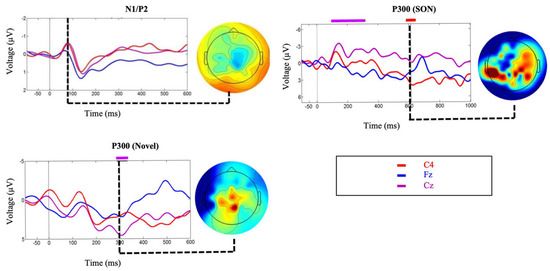 Event related potentials corresponding to Case Study 3. Exogenous ERPs were observed (overlaid on participant averages) in response to the standard tone of the Modified Fischer paradigm (N1/P2). Significant differences were observed (overlaid on participant averages) for brain responses to novel stimuli and SON as part of the Modified Fischer paradigm. Topographic maps at each point of significance show dominant activity in the posterior areas of the brain, decentralized, as typical of many brain-injured individuals. Figure 7 has been adapted from Blain-Moraes et al. 2016, “Figure 2” [69] and is licensed under the CC BY 4.0 (https://creativecommons.org/licenses/by/4.0/. Accessed on: 27 April 2017).