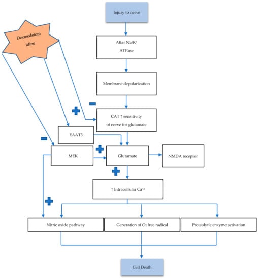 Nerve injury causes dysfunction of NA/K ATPase, leading to an imbalance between neurotransmitters. Increasing CAT level enhances the sensitivity of nerves to glutamate (Glu). Excessive Glu increases intracellular Ca2+, which in return activates the aforementioned pathways, resulting in cell death. Activation of the mitogen-activated/extracellular signal-regulated kinase (MAK) pathway also increases Glu concentration. The α2 adrenoreceptor exerts its possible neuroprotective mechanism by hyperpolarization, which blocks the Ca2+ entry into presynase. Low Ca2+ diminishes neurotransmitter release (CAT) and Glu and also decreases nerve sensitivity for Glu. DEXM also enhances Excitatory amino acid transporter 3 (EAAT3) activity, which removes Glu from the synaptic cleft. Hyperpolarization also reduces NMDA receptors, which also decreases firing and reduces intracellular Ca2+. DEXM also blocks MEK, resulting in decreased excitotoxic neuronal injury.