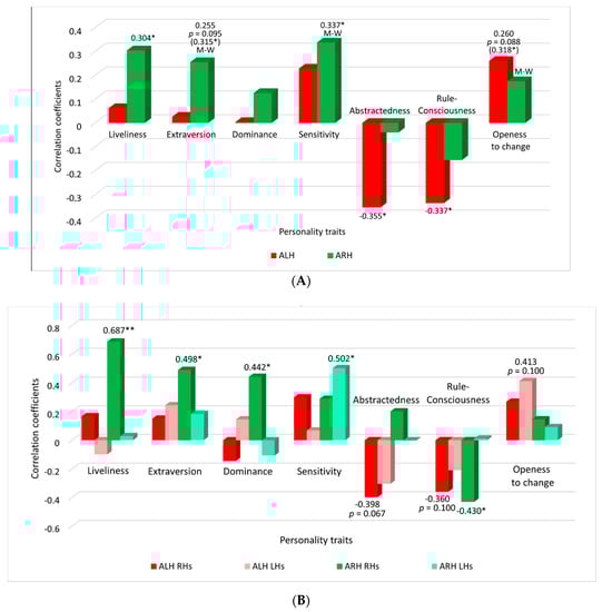 Nonparametric (Spearman’s) correlation coefficients between personality traits and the accuracy of classification of brain signals when imagining movements of the right (ARH, green columns) and left hand (ALH, red columns) in comparison to the rest. (A)—data of all participants (“pure” right-handers and latent left-handers together), (B)—data of “pure” right-handers (RHs) and latent left-handers (LHs) separately. Significant correlations are marked with an asterisk (*) (p < 0.05) or two asterisks (**) (for p < 0.01), p-value is indicated in a case of trend. Significant (p < 0.05) differences between subgroups with a high and low value of the factor according to Mann–Whitney test are marked with M-W.