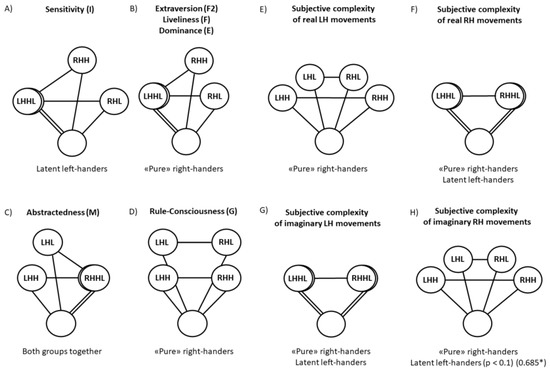 Scheme of the mutual location of areas of state of parameters calculated from EEG characteristics and used for classification, characterizing different brain states: at the rest (empty circles), while imagining movements of the right hand (RH) or left hand (LH) with low (L) or a high (H) value of an individual personality trait or subjective complexity of real or imaginary movements among “pure” right-handers, latent left-handers and both groups together. The distance between circles corresponds to the classification accuracy of brain states. p-value and Pearson correlation coefficients (in parenthesis with an asterisk) are indicated in a case of Spearman trend (Figure 2H). The description and explanations for the figure are given in the text.