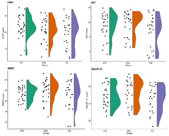 Raincloud plots for tasks of social cognition and quality of life scores among groups of patients with extratemporal (ETE), generalized (GGE) and temporal lobe (TLE) epilepsies. FPRT—faux pas recognition test (total score), HST—the Happé strange stories test, RMET—Reading of the Mind in the Eyes test, QOLIE-31—The 31-item Quality of Life in Epilepsy inventory (total score).