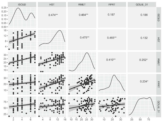 Correlations between the level of education, ToM and ER tasks and the measure of quality of life. *—p < 0.05, **—p < 0.0001. FPRT—faux pas recognition test (total score), HST—the Happé strange stories test, ISCED—The International Standard Classification of Education, RMET—Reading of the Mind in the Eyes test, QOLIE-31—The 31-item Quality of Life in Epilepsy inventory (total score).