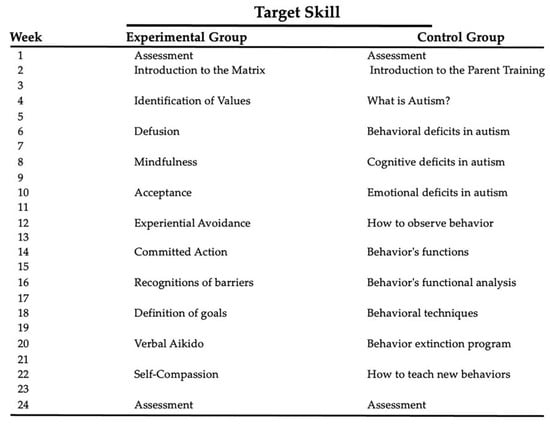 The two experimental protocols were developed for a total of 24 weekly meetings lasting 90 min each. The total intervention lasted six months. Parent pairs were randomly assigned to the experimental group (ACT matrix protocol) or to the control group (PT protocol) (Figure 1), using a computer-generated randomization code. Before the intervention, both groups participated in a common meeting in which the particular behavioral characteristics of children were illustrated in order to provide knowledge and awareness of the diagnosis.