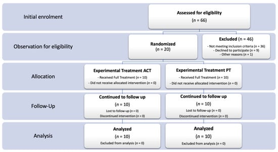 We enrolled N = 66 pairs of parents of 66 children with ASD, aged 30 months to 13 years. A first screening based on inclusion criteria was implemented and n = 20 pairs of parents of children with ASD (18 male/2 female) fully met the admission criteria and were enrolled in the present study. Parents were randomly assigned to either the matrix group (TG) or the PT group (CG). Groups were pair matched according to the children’s DQ and parental education. Twenty pairs of parents completed all phases of the rehabilitation protocols and were included in the statistical analysis (Figure 2).