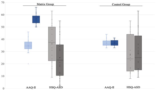 Furthermore, after the intervention, we found a significant improvement in TG on AAQ-II, U = 400, W = 610, Z = 5.42, p < 0.001 (Figure 3; Table 2), with a gain of 64% in the total score, and all parents in the group improved between 16 and 32 points (Table 3). Conversely, the CG did not improve, with a maximum range of change between −2 and 4 points, U = 221, W = 431, Z = 0.577, p = 0.583. A smaller improvement, and only significant before correction for multiple comparisons, was also present for HSQ-ASD in TG (Figure 3), U = 119, W = 329, Z = −2.18, p = 0.028, with a reduction of 32% in the total score, while for CG there was no change, U = 208, W = 428, Z = 0.488, p = 0.383. A similar pattern held for VLQ, MAAS, and marginally for PSI/SF (Table 3).