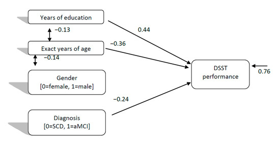 In relation to the directed relationships of individual-demographic factors and diagnosis regarding SCD and ADD categories, with DSST performance, the path model which was finally confirmed (Model 2), χ2 (2, 306) = 0.111, p = 0.946, CFI = 1.00, SRMR = 0.00, RMSEA = 0.00 (90%CI: 0.00–0.01), showed more clearly the same relationships. However, as expected, the stronger relationship in this case was between diagnosis and DSST performance (see Figure 2), with people with SCD being more likely to perform well and significantly better than ADD patients. Thus, this model seems to confirm the hypotheses of the study and especially Hypothesis 1 (H1), as well. The correlations between the predictive variables in this model represent the composition of each diagnostic group and the differences between them.