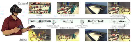 On informed consent, participants were cast into two training groups, namely control or stress, and led through a VR-based pipe-maintenance task. The virtual interface simulated a chemical power plant with hazards and visual elements that provided participants a salient view of the work environment []. The task required participants to execute a sequence of 8 valve operations using the VR hand-held controller. The sequence was shown to the participant before the start of the task. The protocol (see Figure 1) included distinct familiarization, training, buffer, and evaluation segments. During the familiarization period, a virtual cue guided participants through the valve sequence, and participants completed three trials in this phase. All trials were approximately 1-min long. In the training phase, participants were required to repeat the valve sequence under the absence of the virtual cue; however, on committing an error, the interface terminated the experience and the subsequent trial transitioned to familiarization. Participants completed eight trials under this mode, switching to familiarization contingent on their performance errors. Notably, for the stress group, the environmental perturbations (stressors; e.g., fires, alarms, and smoke) were provided most of the time during the familiarization and training period. In the following buffer task, participants were asked to move around the VR environment with no specific objective. The purpose of this segment was to give the participants adequate time to consolidate the memorized sequence [,]. In the evaluation period, participants were expected to recall the valve sequence, and execute the entire sequence in VR. Half the trials during this evaluation period were under environmental perturbations while the remainder were under no-stress or control conditions for both training groups. The order of stress and control trials was counterbalanced. Figure 1 has ‘S’ and ‘N’ notes illustrating the environmental condition of the trial, where ‘S’ means that the trial was completed under stressful conditions and ‘N’ means the trial was completed under normal conditions.
