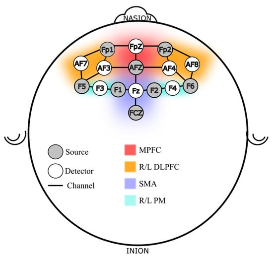 In addition to the VR hand-held controller used to execute the sequence, participants were instrumented with a continuous wave fNIRS device (NIRSport 2, NIRx Medical Technologies, New York, NY, USA) with a probe map focused on cortical locations defined following the 10-10 international systems using a sixteen-probe design. There were 21 channels across a network of brain regions responsible for motor learning and working memory function []. Figure 2 shows the probe design used in this study. The probe locations can be roughly divided into six regions of interest (ROI), per Brodmann locations and functions [,], three in Brodmann area 9: Medial and Dorsolateral PFC (L/R DLPFC and MPFC), and three in area 6/8: the Premotor (L/R PM) and Supplementary Motor Area (SMA). The DLPFC and the premotor regions were chosen because the PFC works closely with the premotor and supplementary motor areas for complex motor tasks such as sequence learning [,,]. Additionally, stress affects PFC activity and its ability to perform memory related tasks, therefore, PFC is an important region to monitor both for memory and stress related activities [].