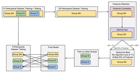 ML workflow diagram. The diagram illustrates the division of the dataset into training and testing. The training data from the Group SN is used to find the best combination of an ML algorithm and N% of the best features to classify encoding and retrieval of information. Once they are determined, they are used to train two models on Group N and Group S data. The final three models are then tested on the testing datasets, and the F1-Score and accuracy of detecting memory encoding and retrieval are reported.