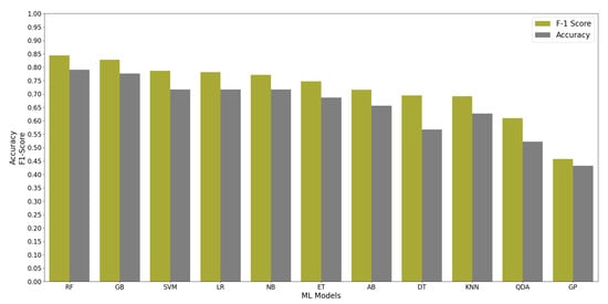 The dataset of 31 participants was divided into training and testing datasets. The training dataset has data of 26 participants and the testing dataset has data of five participants. The training dataset was used to train 11 ML algorithms. The ML algorithms used were Logistic Regression (LR), K-Nearest Neighbors (KNN), Support-Vector Machines (SVM), Gradient Boosting (GB), Extra Trees (ET), Decision Tree (DT), Random Forest (RF), Naive Bayes (NB), AdaBoost (AB), Quadratic Discriminant Analysis (QDA), and Gaussian Process (GP). The parameters of these algorithms were tuned using Randomized Grid-Search over 50-iterations [,]. To avoid overfitting the algorithms while tuning the parameters, a 5-folds cross-validation method was used while training the algorithms on the training dataset. To increase the efficiency of the algorithms, two feature selection methods were used. The first method used Pearson’s pairwise correlation to dropout correlated features. The method resulted in no changes as features were not correlated. The second method used the Analysis of Variance (ANOVA) test [,]. This test compared every feature individually to the class label, and the importance of the features was evaluated based on the ANOVA F-value. First, the Group SN dataset was used to determine the importance of all features. Then, the algorithms were trained 100 times, each time using the best N% of features, where N is an integer number from 1 to 100. The algorithm and N% of features resulting in the best F-1 score are then trained on Group N and Group S. As shown in Table 2, the encoding and retrieval labels are not balanced, which makes the accuracy score less reliable in interpreting the results. F1-score represents the harmonic mean of precision and recall; thus, it is used to determine the best performing algorithm and features []. To examine how the environmental conditions impact brain regions and the performance of machine learning classification. Three models were trained on the training data of the three groups (SN, N, S), and then each model was tested on each of the testing datasets. Based on these final models, the importance of each feature was re-calculated using the permutations of importance measure. This measure iterates through the features and replaces each feature’s values with noise signals and re-calculates the feature’s importance by tracking the changes in the model accuracy. Small to no changes in accuracy indicates the low importance of the feature. Figure 3 illustrates the overview of the machine learning workflow, and the results are discussed in detail in Section 3.