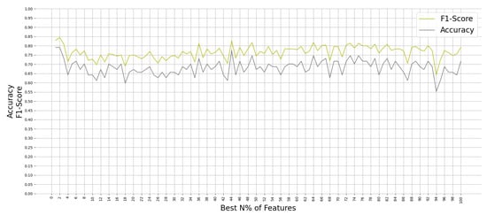 Performance of Random Forest on Group SN testing dataset when trained on N% of the best features.