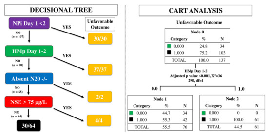 To assess the best multimodal approach, we first used a time-dependent decisional tree (i.e., NPi on day 1; HMp on day 1–2; absent N20 on day 2–3; highest NSE value over the first 3 days); this approach was based on the time of assessment, i.e., the first tool being NPI on day 1, followed by HMp on day 1 or 2, absence of N20 on day 2–3 and, finally, the highest NSE value within the first 72 h. Thereafter, we analyzed the most significant predictors associated with UO by classification and regression tree (CART) analysis, which allows partitions observations in a matched data set, consisting of a categorical dependent variable (i.e., UO) and one or more independent explanatory variables (i.e., predictors), into progressively smaller groups. Each potential binary splits are examined and the split that maximizes the discrimination of the two resulting groups (i.e., UO vs. others) is chosen. The analysis is therefore continued into the remaining patients to reassess the possibility to maximize discrimination again []. A p value < 0.05 was considered statistically significant. Statistical analyses were performed using SPSS (IBM SPSS Statistics 25.0 for Macintosh).
