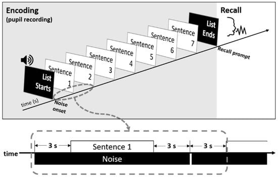 - Koo, M.; Jeon, J.; Moon, H.; Suh, M.; Lee, J.; Oh, S.; Park, M. Effects of Noise and Serial Position on Free Recall of Spoken Words and Pupil Dilation during Encoding in Normal-Hearing Adults. Brain Sci. 2021, 11, 277. [Google Scholar] [CrossRef]