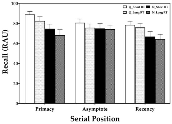Recall scores in the quiet condition versus four-talker babble noise with short or long reverberation time (RT). Error bars represent ±1 standard error of the mean. Note: Q, quiet condition; N, noise condition; RAU, rationalized arcsine unit.