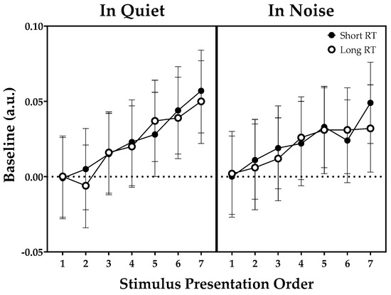 Baseline in the quiet condition versus 4T noise as a function of stimulus presentation order (short or long RT) are shown in Figure 3. The LMM on the baseline values demonstrated a significant fixed effect of stimulus presentation order, indicating an increase in sentence baseline relative to the initial sentence baseline with the increase in memory load (number of items to be remembered). No other significant effects were found.