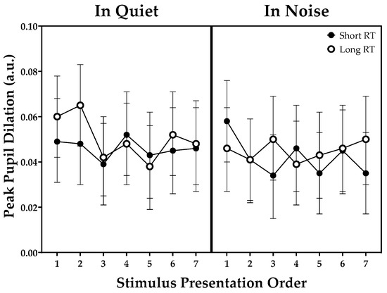 Peak pupil dilation values in the quiet condition versus four-talker babble noise as a function of stimulus presentation order. Error bars are 95% confidence intervals for the mean. Note: RT, reverberation time.