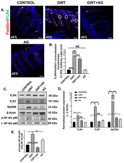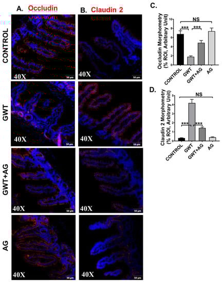 3.3. AG Treatment Improves the Integrity of Intestinal Tight Junction Proteins and Decreases GW Chemical-Induced Gut Leaching