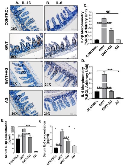 3.5. AG Treatment Diminishes Both Intestinal and Systemic Inflammation in a Mouse Model of GWI