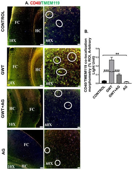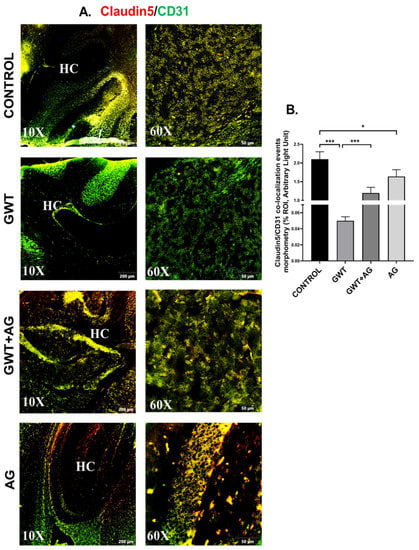 3.6. AG Reverses GWI-Associated Altered Expression of Blood–Brain Barrier (BBB) Claudin-5 Protein and Microglial Activation