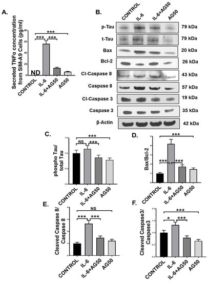 3.8. AG Lessens TNFα Production from Reactive Mouse Microglial Cells, Concomitantly Protects Mouse Neuronal Cells from Extrinsic Apoptosis and Tau Hyperphosphorylation