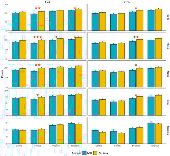 Power across answer (on-task vs. MW) for different frequency bands (delta, theta, alpha, beta and gamma) depending on group (Schizophrenia—SCZ vs. Control—CTR) and region (Central, Frontal, Posterior and Temporal). Red asterisks represent significance: *** p < 0.001, ** p < 0.01, * p < 0.05.