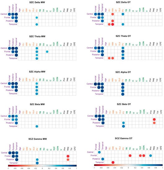 To explore a possible relationship among power in each scalp region, measures of attention (D2), cognitive functioning (SCIP), positive and negative symptoms (PANSS) and the chlorpromazine (CPZ) dose in the patient group, we calculated the Spearman correlation coefficient among these variables. The false discovery rate (FDR) procedure [] was used to control the increase in type I errors due to the number-of-significance test. The results are shown in Figure 3, and only significant coefficients are shown. We found significant and positive correlations between theta and alpha amplitude and processing speed both in MW and on-task participants. We also found a significant and negative correlation between the amplitude of slower rhythms and working memory, especially in the temporal region when participants were on-task.