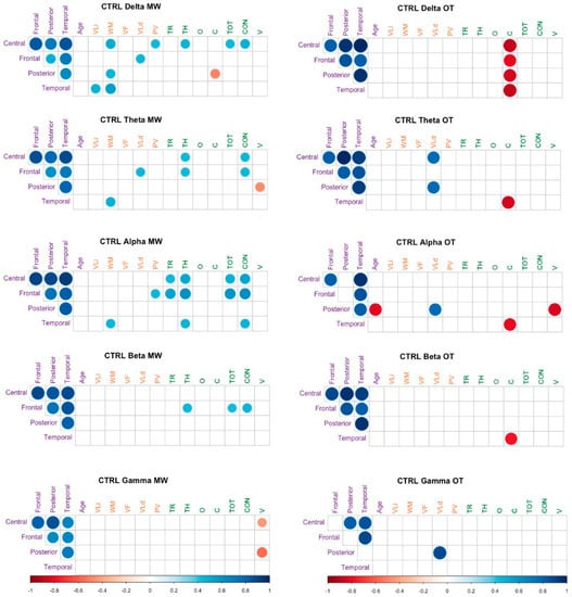 Similarly, in the control group, we calculated the correlation between power in each scalp region and our measures of attention (D2) and cognitive function (SCIP). The FDR procedure [] was used to control the increase in type I errors due to the number of significance tests. The results are shown in Figure 4. It is noteworthy that when participants were on-task, a significant negative correlation was found between commission errors in almost all rhythms, especially in the temporal region. Likewise, in alpha, there seems to be a relative disconnect between the power of the posterior region and that of the central and frontal regions. On the other hand, when participants were in MW, power in frontal and central regions seemed to be associated with measures of attention.