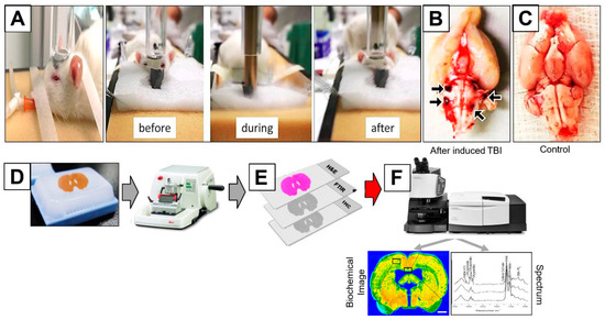 - Rakib, F.; Al-Saad, K.; Ahmed, T.; Ullah, E.; Barreto, G.E.; Ashraf, G.M.; Ali, M.H. Biomolecular alterations in acute traumatic brain injury (TBI) using Fourier transform infrared (FTIR) imaging spectroscopy. Spectrochim. Acta Part A Mol. Biomol. Spectrosc. 2021, 248, 119189. [Google Scholar] [CrossRef] [PubMed]