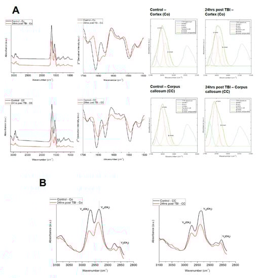 Representative FTIR averaged spectra. (A) FTIR averaged spectra in the range of 3100–700 cm−1 acquired from Co and CC region of control gray matter and white matter. Average second-derivative spectra of the amide I band (spectral range of 1700–1600 cm−1). The spectra show α-helical (secondary protein) structure at 1655 cm−1 and β-sheets protein conformation at 1630 cm−1. Representative curve fitting of the amide I band in the spectral range of 1700–1600 cm−1 comparing the control and 24 h post-injured Co and CC. (B) Representative FTIR spectra averaged from control (black) and mTBI (red) for lipid region in Co and CC.