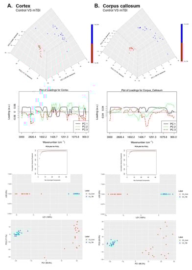 PCA (Figure 5A,B) was performed on the spectral second derivatives in the range of 4000–700 cm−1 (range of 2500–2000 cm−1 was removed) for the control and mTBI brains from Co (Figure 5A) and CC (Figure 5B). Loading plots and PCA plots were also given, along with their 3D PCA diagrams. Spectral differences were clearly seen from the loading plots between the groups. The distinctions were principally in the range of 2525–2980 cm−1, which associated to the molecular changes in the lipids. Moreover, there were molecular variations in the spectral region of 1530–1680 cm−1, which was identified by proteins in the brain tissue. The scores plot uncovered that spectral information gathered from the rat cerebrum cortices were clustered into two particular gatherings that associated with control and influenced by mTBI. The unmistakable isolation between the two gatherings in the PCA score plots demonstrated that the molecular makeup of the cortical brain tissue changed because of mTBI with the primary 3PCs representing ~66% of the total variation. Another crucial ~17–21% were impacted by various factors.